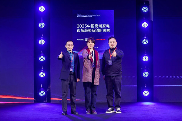 京东集团副总裁谢帆(右)、中国度电网副总编刘瑛(中)、NIQ GfK家电群众计谋客户总监蔡凌(左)共同发布《2025中国高端家电市集趋势及转换瞻念察》酬劳