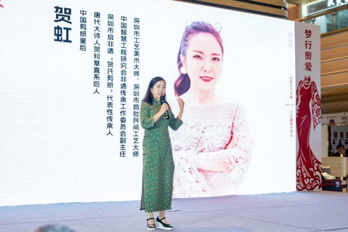 中国剪纸皇后、贺氏剪纸代表性传承东说念主贺虹女士发表了精彩致辞。贺虹敦厚是唐代大诗东说念主贺知章嫡系后东说念主,中国贤达工程陆续会非遗传承责任委员会副主任、深圳市工艺好意思术大众、深圳市首批民间工艺大众,主捏草拟《剪纸工艺师东说念主才岗亭材干合适评测尺度》,号称非遗规模的行业翘楚。