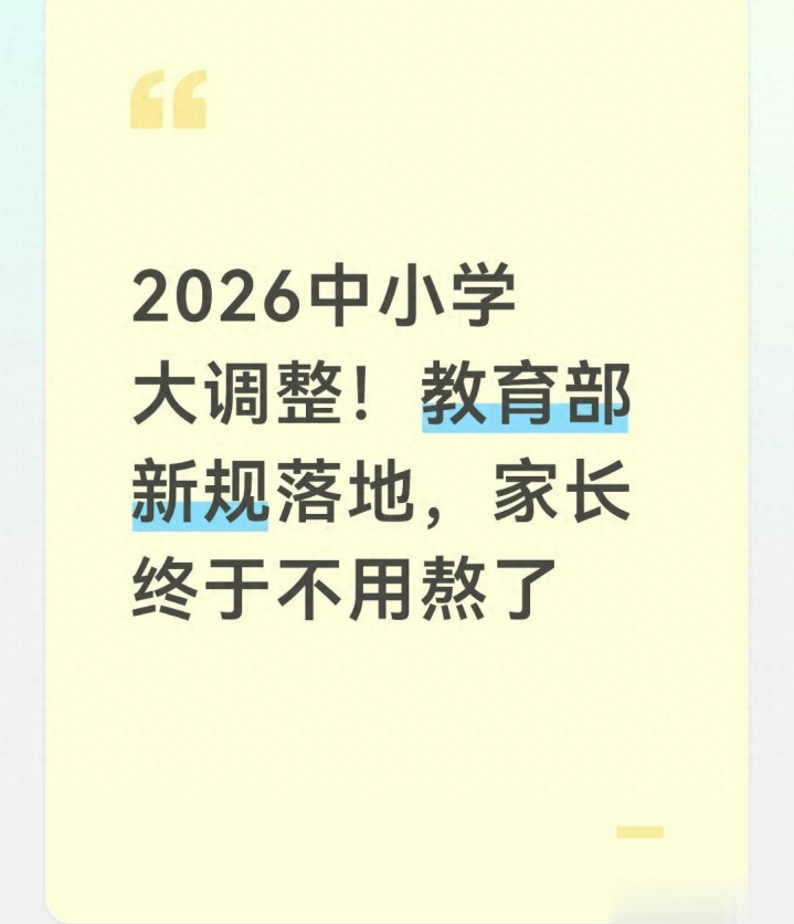 上周去妮儿的小学开家长会,班主任刚念完援手部的新告知,教室里平直炸了锅,后排的张姐一拍大腿喊出声:“可算熬露面了!孩子天天写功课到更阑,我随着陪到十点,这日子总算要变了!”信赖不少家长王人和咱们雷同,拿起孩子的援手就满肚子苦水:功课多到写不完、为了学区房掏空钱包、下昼三点下学没东说念主接、校外补习班报了一堆却没扫尾……这些压在家长心头的石头,终于要被2026年的中小学援手大转化搬走了。